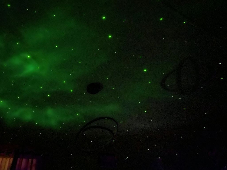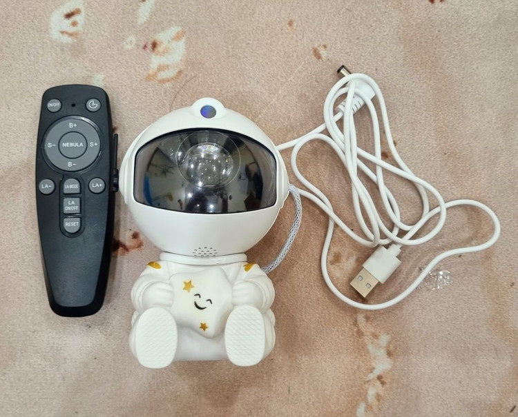 پروژکتور کهکشانی طرح فضانورد نشسته یک چراغ خواب با قابلیت پخش افکت تصویر زنده کهکشانی بر روی سقف و دیوار اتاق است که به همراه افکت لیزر ستاره ای حس یک سفر کهکشانی را قبل از خواب به شما میدهد . تلفیق همزمان تصویر زنده کهکشانی و لیزر ستاره ای جذابیت اتاق خواب شما را چندین برابر میکند . این محصول دارای ریموت کنترل نیز می باشد که میتواند نور پرژکتور یا لیزر را کم یا زیاد و یا برای روشن ماندن محصول تایمر تعریف کنید . برای روشن کردن این محصول باید از آداپتور موبایل استفاده کنید و از طریق کابل داخل بسته بندی آن را شارژ نمایید.